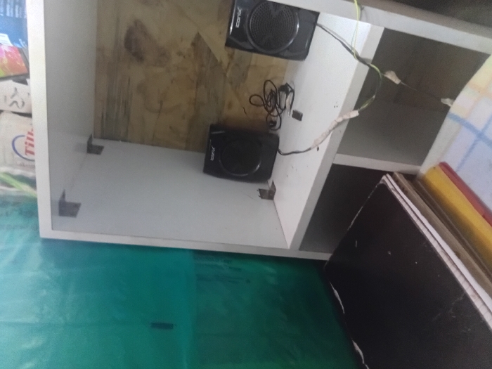 An eye-level shot captures a white, open-backed shelving unit with two black speakers mounted inside. The shelving unit is against a wooden back panel. Wires are visible, connecting the speakers within the unit. A stack of books with a dark cover and yellow edges sits to the right of the shelf. The shelving unit is resting on a green surface. A box of goods can be seen to the left.