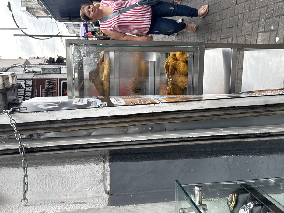 The image depicts an urban street scene in Perimetro Urbano Pereira, Colombia, under an overcast sky. On the far left, a portion of a glass display case is visible, containing two watches on black stands. Adjacent to this, a gray and white painted building facade features a metal chain secured at its upper section, extending towards a narrow, dark vertical panel. This panel displays a partially visible advertisement. To its right, a multi-tiered, stainless steel food display cart with clear glass panels is positioned. The cart's top shelf holds several light-colored fried food items, while the middle shelf contains more fried items, with visible condensation on the glass. The third shelf from the top contains a quantity of darker golden-brown fried items, consistent with chicken pieces, arranged on a metal grate. The two lowest shelves of the cart are empty and metallic. A woman walks from right to left in the middle ground, partially obscured by the food cart. She wears a red and white striped sleeveless top, blue ripped jeans, and light-colored flip-flops, carrying a dark blue cross-body bag. Her hair is light brown and pulled back. The ground is paved with light-colored bricks or cobblestones. In the background, an adjacent building facade displays an advertisement for "ARROSANO" featuring sausages. A street lamp and blurred figures of other pedestrians are also visible further down the street.