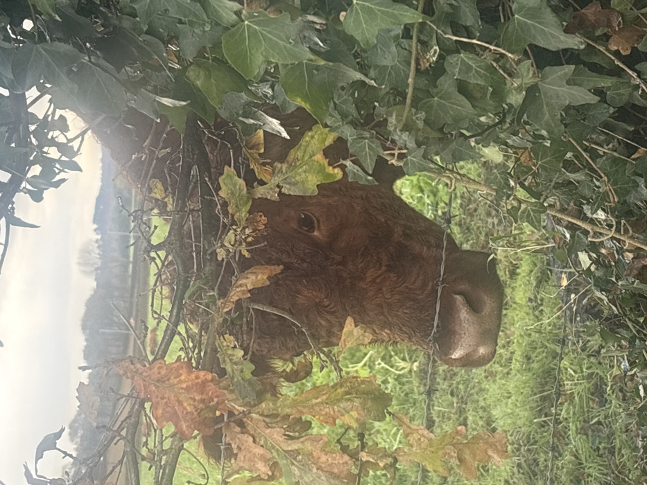 - "A brown cow's head is partially obscured by dense foliage, consisting of bare branches, dried brown and green oak leaves, and dark green ivy" by FM-EamXR2, licensed under CC BY 4.0