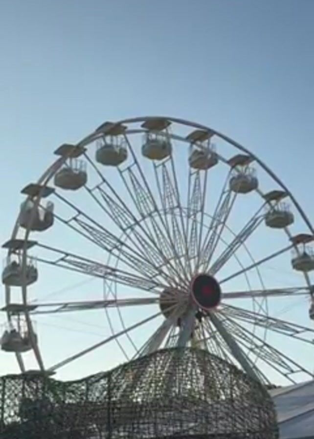 A Ferris wheel stands against a pale blue sky