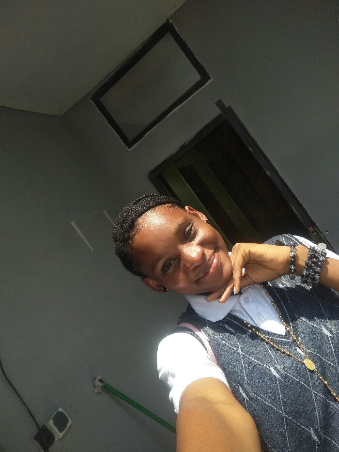 A young individual, appearing female, with dark skin and short dark braided hair, smiles directly into the camera while taking a selfie in Cotonou, Benin