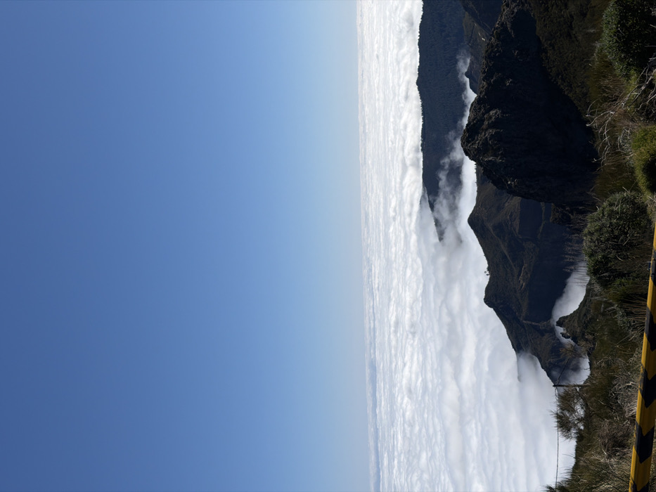 The image displays a high-altitude panoramic view of a mountainous landscape in Santana, Portugal. A clear, light blue sky occupies the upper two-thirds of the frame. Below the sky, a vast, uniform layer of dense white clouds stretches horizontally, resembling a cloud sea. Dark, rugged mountain peaks and ridges, some partially covered with dark green vegetation, emerge from or are surrounded by this cloud layer, particularly in the lower mid-ground and right foreground. The immediate foreground on the left shows sloping terrain with sparse, dry-looking green and brown scrub brush and grasses. A yellow and black striped barrier, indicative of a roadside or viewpoint guardrail, is positioned at the bottom left corner. No individuals or specific activities are visible within the scene.
