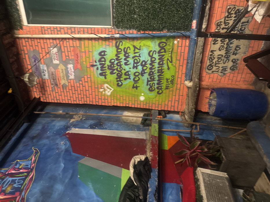 A vibrant urban scene depicts graffiti art on a brick-like wall. The artwork features colorful words like "Felicidade" and "Amor," alongside a green-hued phrase "AINDA NAO CHEGAMOS LA MAS FICO FELIZ POR ESTARMOS CAMINHANDO." Below, a mural with geometric shapes and a depiction of what seems to be a city is present. Plants and assorted objects like a barrel and boxes sit in front of the murals, adding to the chaotic yet creative atmosphere.