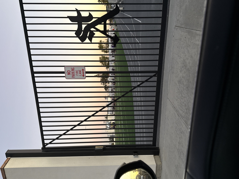 A black, barred gate with a stylized logo at the top stands in front of a sports field with a running track. A "No Parking Fire Lane" sign is attached to the gate. The field is bordered by trees and a building. The sky is visible through the bars of the gate, transitioning from light blue to orange at the horizon, suggesting either sunrise or sunset. The image is taken from inside a vehicle; the side mirror is visible.