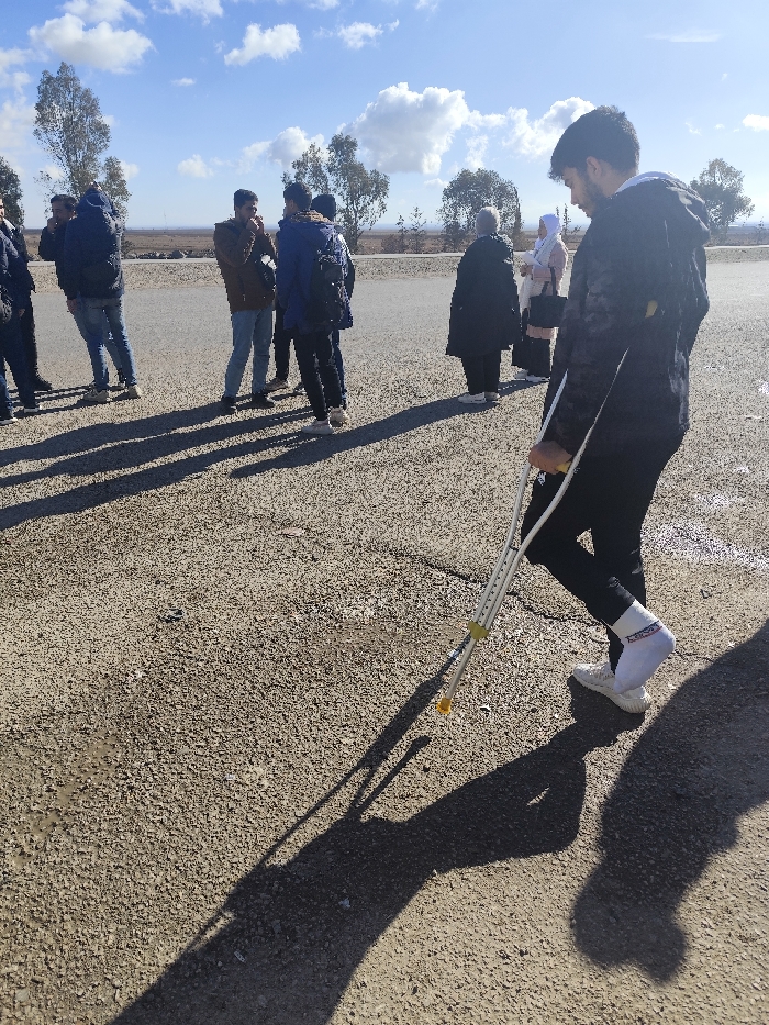 A man with crutches stands in the foreground of a group of people outdoors on a sunny day. He wears a jacket, dark pants, white socks, and sneakers. The ground is a tan gravel surface. Behind him, a group of people stands by a low wall, under a clear blue sky with scattered clouds. Sparse trees dot the horizon. The man's shadow is prominent on the ground in front of him.