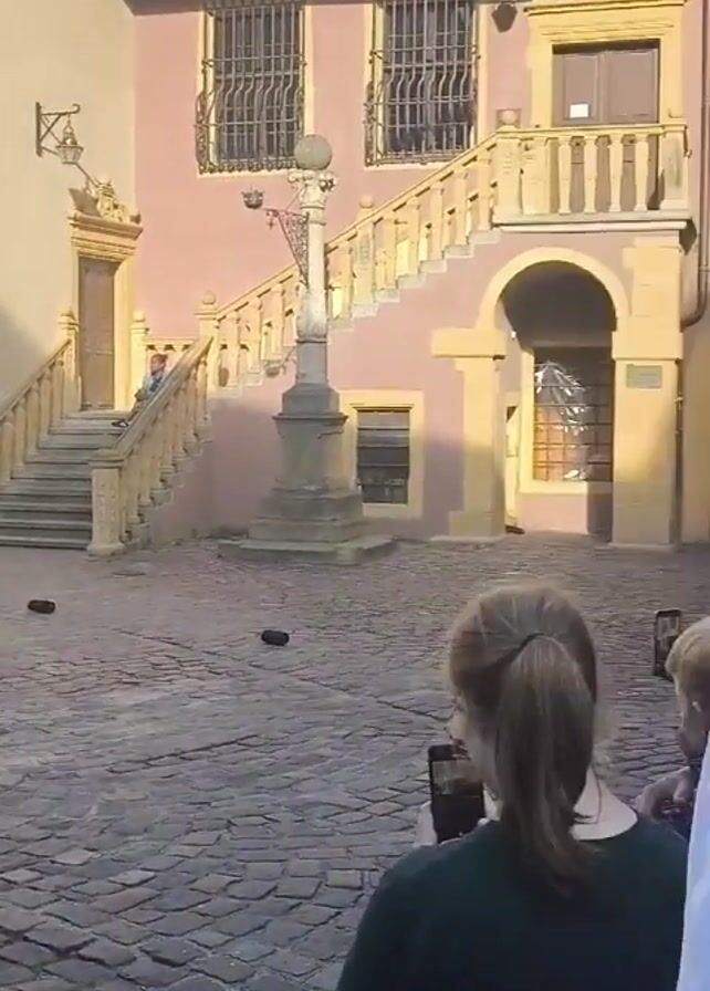 The video captures a scene in a European city square