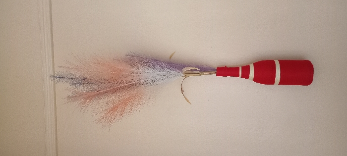 The image displays a wall-mounted decorative item against a light beige, textured wall. A segment of white ceiling molding is visible at the top. The main subject is a long-necked, repurposed bottle, uniformly painted or wrapped in red, featuring two distinct horizontal white bands: one encircling the bottle's neck just below the lip, and another wider band around its body. Emerging from the bottle's narrow opening are multiple tall, feathery plumes of dried ornamental grass, presenting a blend of peach, white, and light purple hues. Several thin, light brown dried stems or leaves are visible at the base of these plumes, just above the bottle's neck. The arrangement is oriented vertically. No specific location within the city of Kisumu, Kenya, can be determined from the visual information provided in the image.