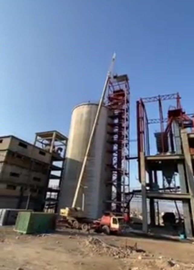 n industrial site with several large structures and machinery under a clear blue sky. A crane is positioned next to a tall cylindrical silo, which has a metal structure with stairs attached to its side. Next to the silo is a multi-level structure with red and gray components, seemingly part of the industrial complex. The ground appears to be dirt and gravel. There is a shipping container on the ground and some other construction materials. The crane's boom is extended towards the top of the metal structure attached to the silo. No people are clearly visible in the shot.