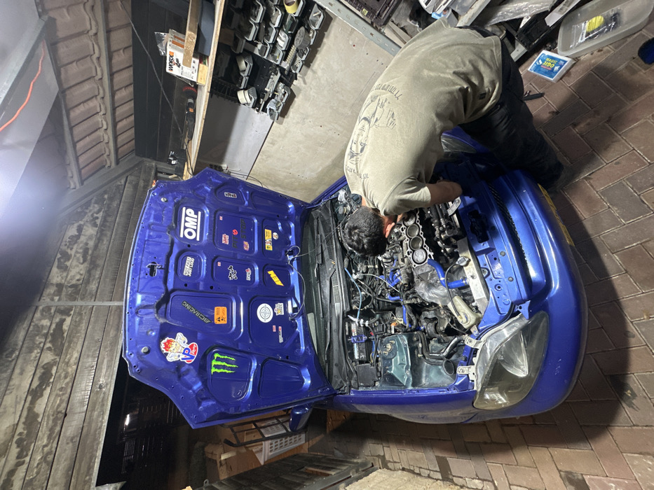 The image depicts a blue Honda Civic with the hood open. A person in a green t-shirt and black pants is working on the engine. The car is in a garage with tools and storage shelves in the background. The location is a residential garage in Bat Hefer, Israel at coordinates 32.34 latitude and 35.013 longitude. The garage is organized, and there are tools and other car parts on the shelves. The person is leaning over the engine, with their head and upper body inside the engine compartment. There are tools and other automotive supplies on the floor. The engine is partially visible, with a variety of hoses, wires, and components. The hood of the car is covered in stickers and decals. The garage walls are made of concrete and are painted white. There is a concrete floor. The lighting is overhead and is not very bright. The garage appears to be a common garage in a residential area of Bat Hefer, Israel. The image appears to have been taken on a mobile phone. The image is in focus, and the colors are well-balanced.