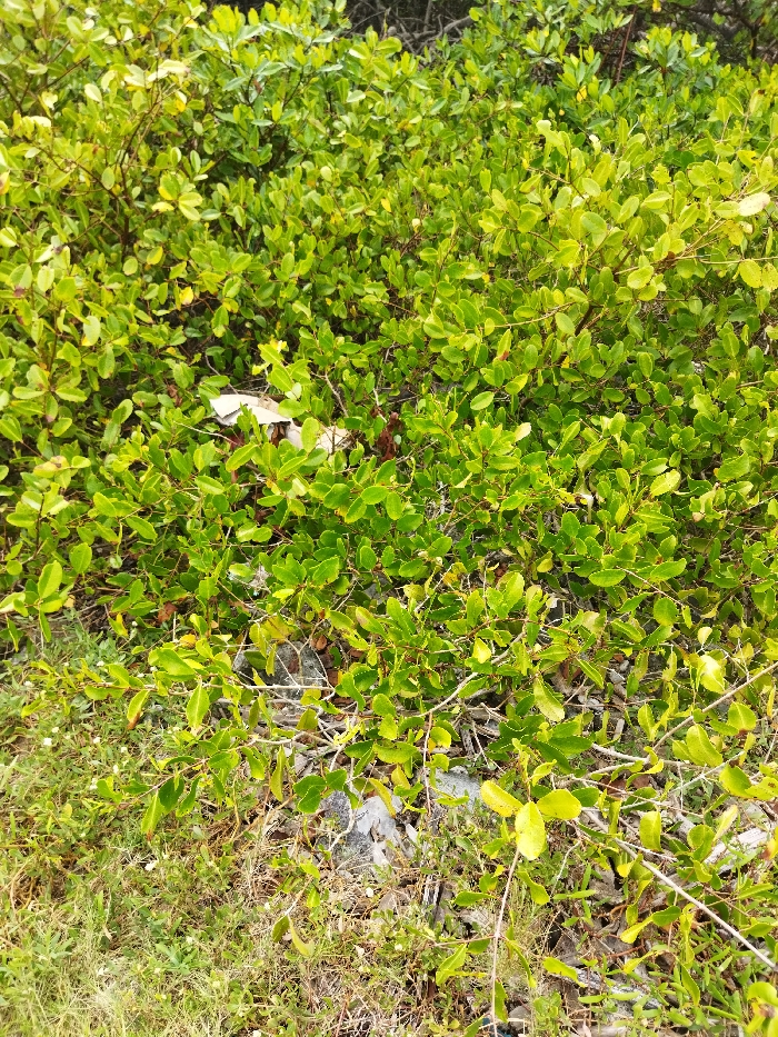 A dense green shrub covers much of the frame. The leaves are small and rounded, creating a textured surface. Underneath, bare branches and some rocky patches are visible. Bits of white paper or debris are interspersed amongst the foliage. The ground shows mixed vegetation with some grassy areas. Light is bright, rendering the leaves a vibrant green.