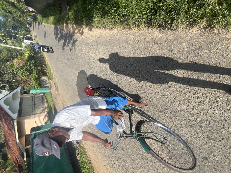 An overhead shot depicts a man on a bicycle, casting a long shadow on the road. He wears a light-colored shirt, blue shorts, a cap, and sandals. The bike is green with a red bag attached. The road, marked with cracks, is bordered by grassy areas and trees. Further down the road, a scooter and car are visible. A house with a red roof and white walls sits to the side, surrounded by greenery.