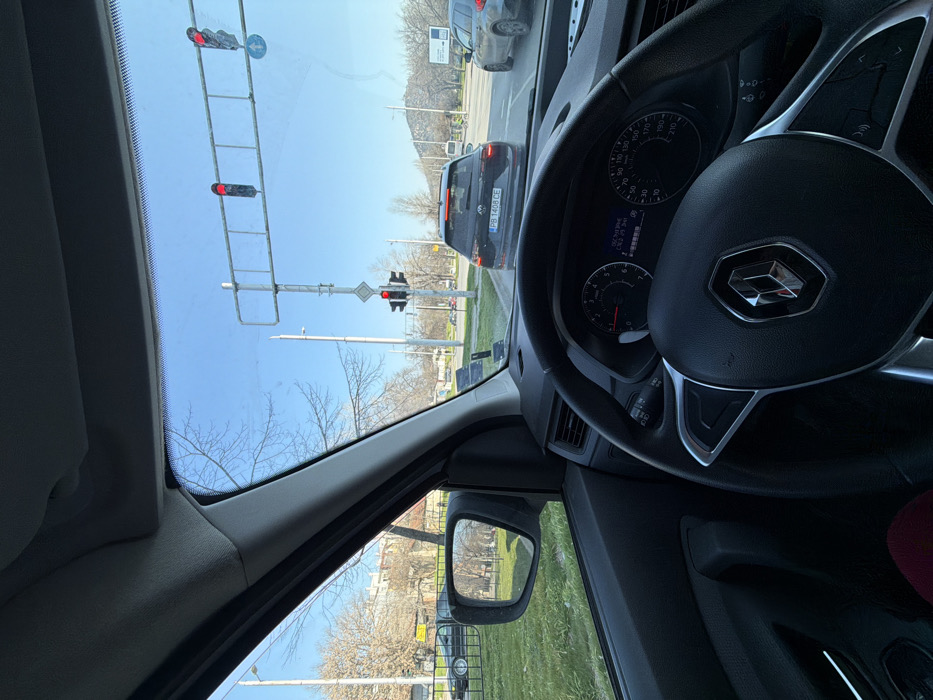 The image depicts an urban street scene from the interior perspective of a Renault vehicle, positioned at a standstill