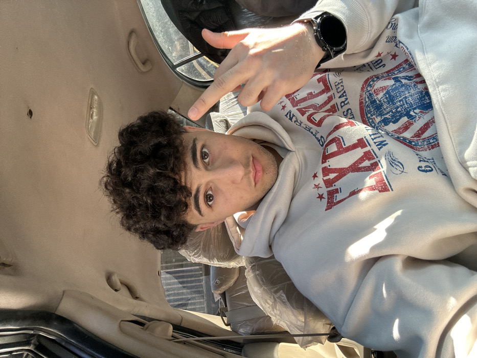 The image depicts a young male individual seated inside a vehicle, specifically in the city of Al-Muhajerin Municipality, Syria. The subject, who appears to be in his late teens or early twenties, has dark, curly hair, dark eyes, and a light complexion. He is wearing a light beige hooded sweatshirt with a distressed red and blue graphic print on the chest, featuring text such as "WESTERN," "EXPLORE," and "WILD HORSES RACE." A dark smartwatch with a black screen and a brown strap is visible on his left wrist. The individual is looking directly at the camera with a neutral expression, while his left hand is raised, extending the middle finger towards the lens. The vehicle's interior features a beige headliner and an overhead light fixture. The back seats are visible through the rear window and are covered with clear plastic protective material. Sunlight is present, casting shadows within the car. The exterior background visible through the car windows is out of focus, showing indistinct architectural elements, possibly indicating an urban or semi-urban setting.