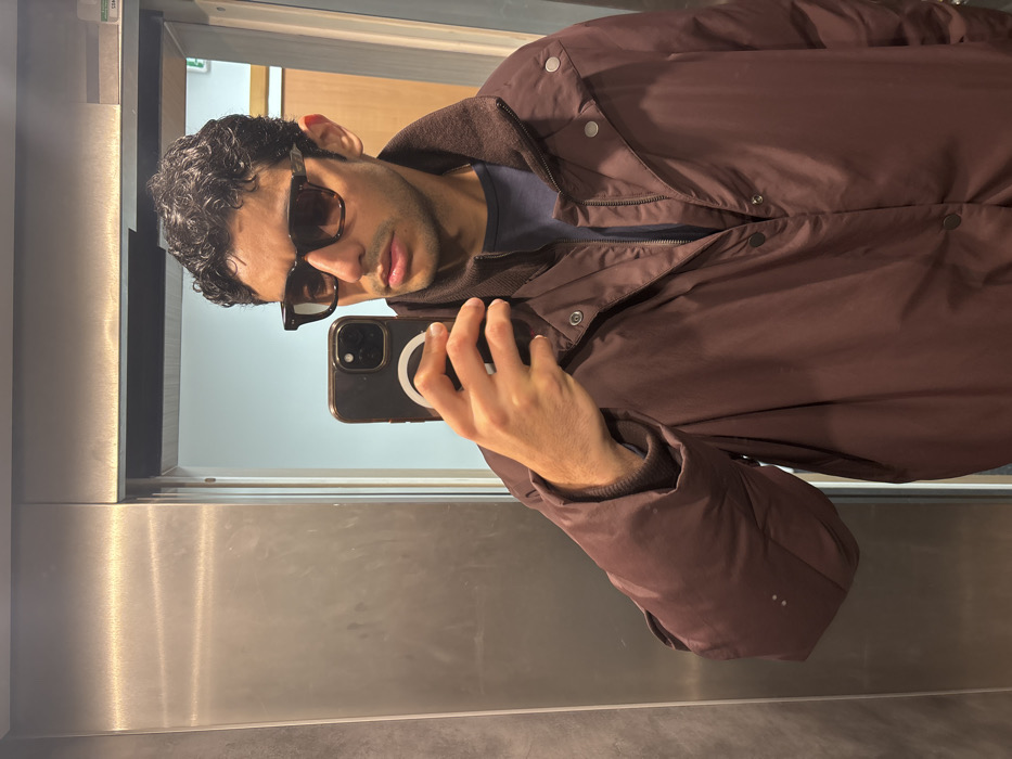 A male individual is depicted in a mirror selfie, located in an interior space within Paris, France. He is positioned facing the mirror, capturing his reflection with a dark-colored iPhone held in his right hand, featuring a prominent white MagSafe ring on its back. The subject has dark, curly hair and is wearing dark rectangular sunglasses, a navy blue or dark grey t-shirt, and an unzipped burgundy-colored puffer jacket with a ribbed dark brown collar and snap button closures. The immediate background reflected in the mirror consists of a brushed metallic panel on the left and a partially visible interior space on the right, which features a light-colored wall and a wooden door or partition frame. The man maintains a neutral expression, looking directly into the camera lens of his phone.