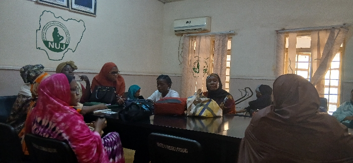 An indoor scene in Unguwan Sanusi, Nigeria, depicts a gathering of approximately 10-12 individuals, predominantly women, seated around a large, dark rectangular conference table. Most individuals are wearing head coverings (hijabs or scarves) in various colors including pink, orange, brown, black, and teal, along with patterned traditional attire. Some individuals appear to be engaged in observation or discussion. On the table, a dark blue/black bag, a red bag, and a large white/yellow patterned bag are visible. The walls are light-colored. A prominent green wall decal shaped like the map of Nigeria, featuring a circular emblem with "NUJ" and a human silhouette, is affixed to the left wall. Two framed items hang above this decal. A white air conditioning unit is mounted on the upper right wall. Two windows, covered by light-colored, semi-translucent curtains, are visible on the right, providing natural light to the room.