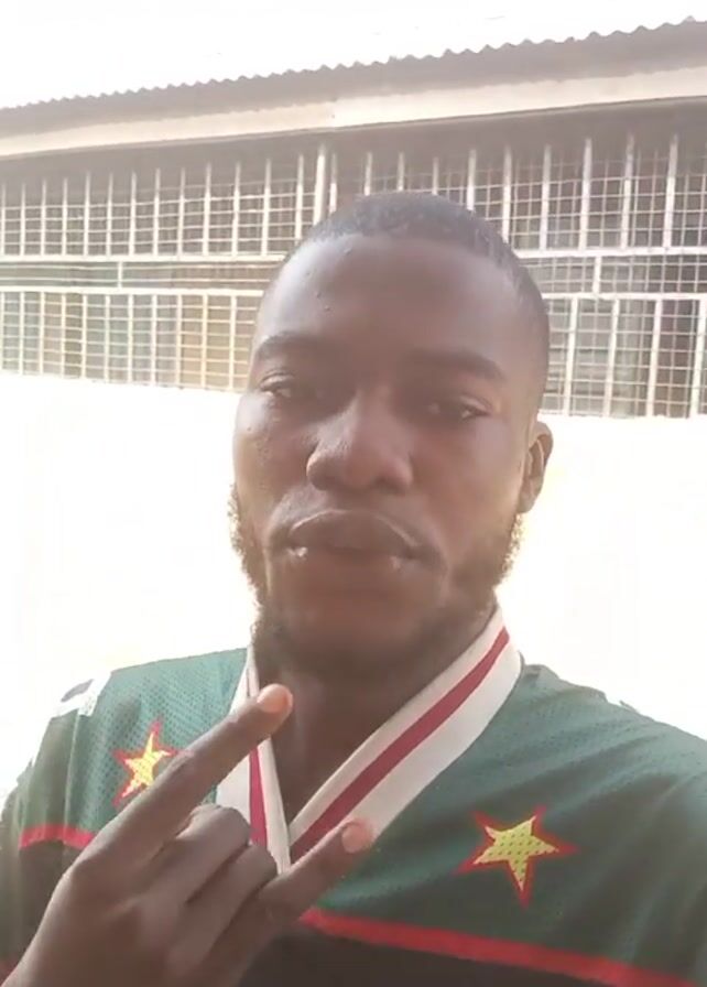 man in a green, black, and red shirt with yellow stars, standing outside. He says "Yo, I'm here in the ghetto, my niggas" and smiles into the camera. The background features a building with barred windows, a fence, and a dirt road.