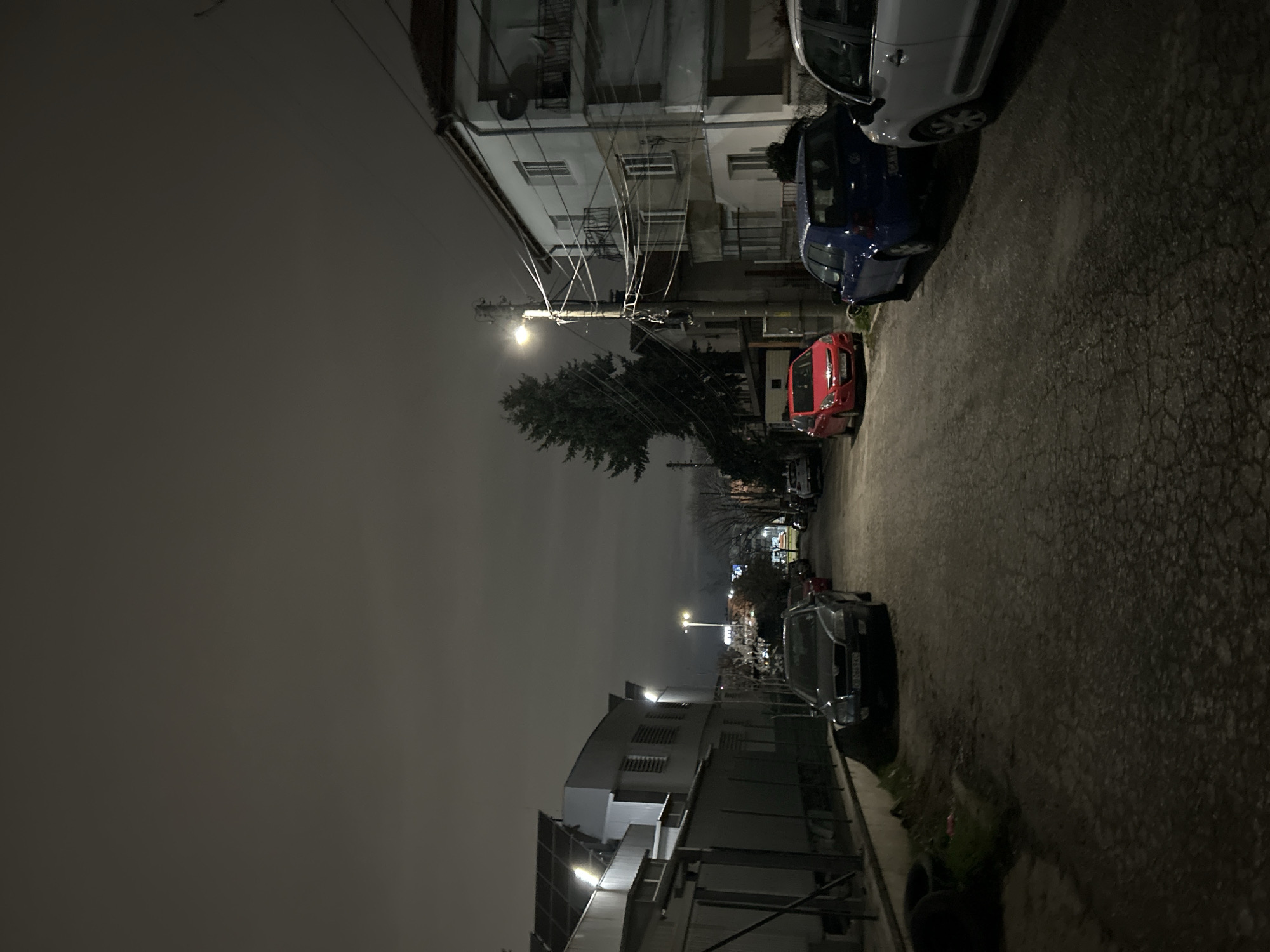 street scene at night, likely in a residential area. The location is suggestive of Sofia, Bulgaria, based on architectural style, the general urban layout, and car makes. The sky is overcast, creating a diffused, foggy lighting effect. The street is lined with buildings of varying heights and architectural styles, mainly three to five stories in height. Parked cars are visible along the side of the road: a white car, a blue car, a red car and a black car. Streetlights illuminate sections of the road, casting shadows and highlighting building facades. Power lines are strung across the street, adding to the urban character of the scene. The road surface is paved and shows signs of wear, with patches and cracks. There is a tree is in the middle of the street. Overall, the image depicts a typical urban environment in a somewhat gloomy nighttime setting.