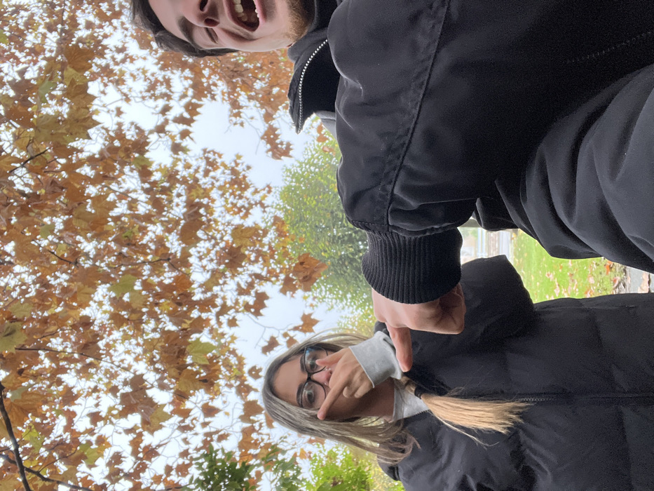 The scene depicts an outdoor setting in Erstein, France, featuring two individuals engaged in a dynamic interaction under an autumnal tree canopy. In the immediate foreground on the right, the upper portion of a male subject is visible, wearing a black puffer jacket over a dark turtleneck. His mouth is open in a wide expression of mirth, with teeth visible, and his right arm is extended towards the left, with the index finger pointing directly at the female subject. The female subject is positioned on the left, visible from the chest up, with long blonde hair, wearing black-rimmed glasses, and a black puffer jacket over a grey long-sleeved garment. Her right hand is raised near her face, with the index finger extended upwards and the thumb partially curled, while her gaze is directed towards the camera. The background is dominated by a dense overhead canopy of deciduous trees displaying predominantly brown and orange leaves, indicating the fall season. An overcast, light grey sky is visible through the foliage, with additional green foliage present in the mid-ground. Traces of green grass and scattered leaves are discernible on the barely visible ground.
