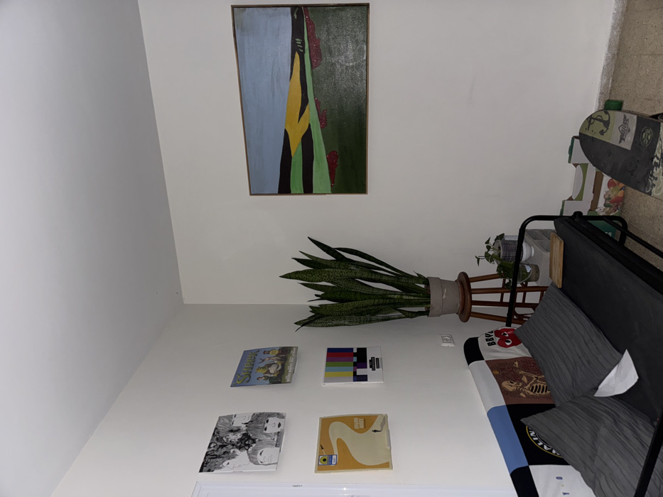 This image depicts an interior living space located within the Gilboa Regional Council, Israel. The room features white walls and a light-colored ceiling. The flooring appears to be a light-toned tile or concrete. On the left wall, four rectangular artworks are displayed vertically and horizontally: 1. Top left: A black and white illustration depicting multiple stylized faces, possibly of a music group. 2. Top right: A poster for the animated film "Shrek," featuring characters Shrek, Donkey, and Princess Fiona. 3. Bottom left: A yellow-orange poster with a winding road design leading to a small figure, accompanied by text that includes "Bruno Mars." 4. Bottom right: A graphic resembling a television test pattern, featuring vertical colored bars and a black and white section below. A white electrical outlet is visible on the wall below the "Shrek" poster. A white door frame is partially visible on the far left. In the corner, a tall snake plant (Sansevieria trifasciata) in a grey pot is positioned on a three-legged wooden stool with a round top. Below the stool, two smaller potted plants, one in a white pot and another in a clear glass container, rest on a grey cinder block. The right wall features a large, horizontally oriented landscape painting. The painting displays a light blue sky, dark blue/black hills, a prominent yellow field, and various green fields with scattered red, possibly floral or structural, elements. The painting is enclosed in a thin wooden frame. In the foreground, a dark-colored sofa or daybed with a visible metal frame is present. Two grey, ribbed cushions are placed on its seat. A multi-patterned blanket, featuring a black and white checkerboard, a skeletal design, and a red heart with "CDG Play" text, is draped over the backrest. A small, light-colored wooden board rests on the right armrest of the sofa. On the floor to the right of the sofa, a skateboard with a dark deck featuring camouflage patterns and anchor graphics leans against the wall, its green wheels partially visible. Adjacent to the skateboard, a cardboard box displaying images of fruit is visible, lying on its side.