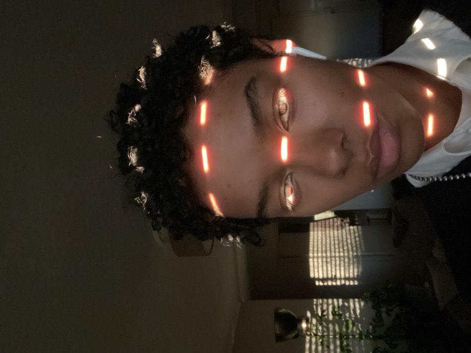 A close-up portrait features a person with curly, dark hair. Intense sunlight shines through blinds, casting vertical streaks across their face and hair. Their eyes reflect the bright light, and their expression is slightly pensive. The background is softly lit, revealing a glimpse of a room with a plant visible through the blinds. The image is rotated, creating a unique perspective.