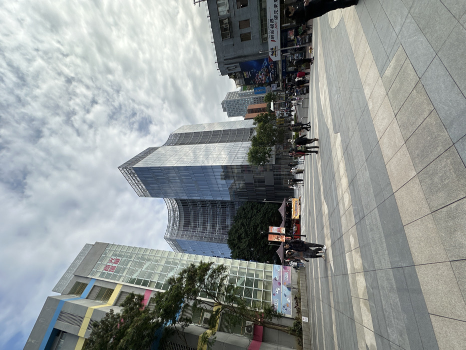 A wide-angle shot of a modern cityscape. Tall glass buildings dominate the skyline under a cloudy sky. The ground is paved with light gray tiles. Trees and people are scattered throughout the scene. In the distance, more buildings and advertisements can be seen. The perspective is tilted.