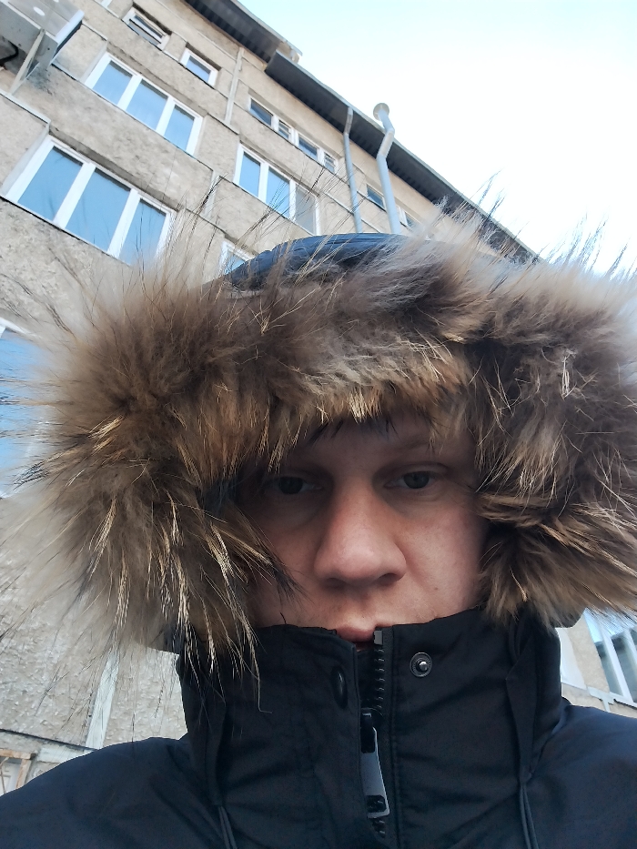 A low-angle selfie depicts a person wearing a dark winter coat with a large, fur-trimmed hood