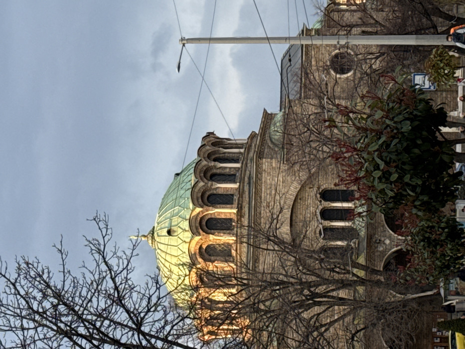 The image displays an exterior view of the Alexander Nevsky Cathedral in Sofia, Bulgaria