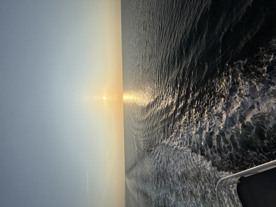 The image displays a wide-angle view of an open body of water at sunset, located in the presumed vicinity of Kato Karioutes, Greece. The horizon line, separating the sky and water, is approximately centered horizontally. The upper portion of the frame features a clear sky, transitioning from a light blue at the top to a warm orange-yellow hue near the horizon. The sun, a bright, circular, golden orb, is positioned low on the horizon, slightly to the right of the frame's center. A pronounced path of intense golden sunlight reflects directly on the water's surface, extending from the sun towards the foreground, creating shimmering highlights on the waves. The water itself is a deep blue-grey, showing moderate surface ripples. In the lower left quadrant of the image, the white, frothy wake of a moving vessel is clearly visible, extending diagonally from the bottom-left corner towards the distant horizon on the left. This wake signifies the active propulsion of a watercraft. Part of a white metal railing, belonging to the stern or side of the vessel from which the photograph was taken, is visible in the extreme bottom-left corner. No individuals or other discernible objects are present in the frame. A faint, dark landmass is barely discernible on the far left horizon.