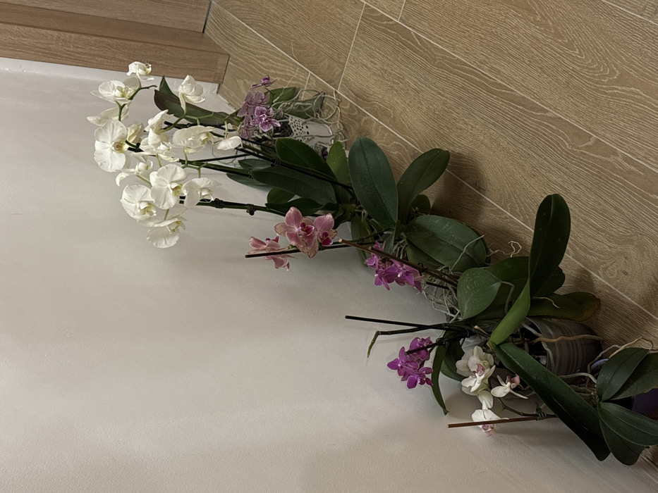 - "An indoor scene depicts a collection of eleven potted orchid plants, primarily Phalaenopsis species, arranged in a linear fashion along a light beige wall" by FM-CcG8d2, licensed under CC BY 4.0