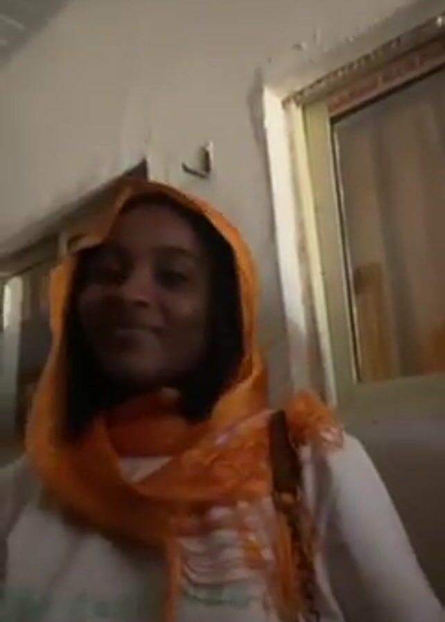 A woman stands in a room with off-white walls and trim. She is wearing a white sweatshirt with faded green lettering, and an orange, fringed scarf wrapped around her head and shoulders. A chain strap bag is visible on her shoulder. She looks at the camera and smiles, then laughs. Behind her are two windows.