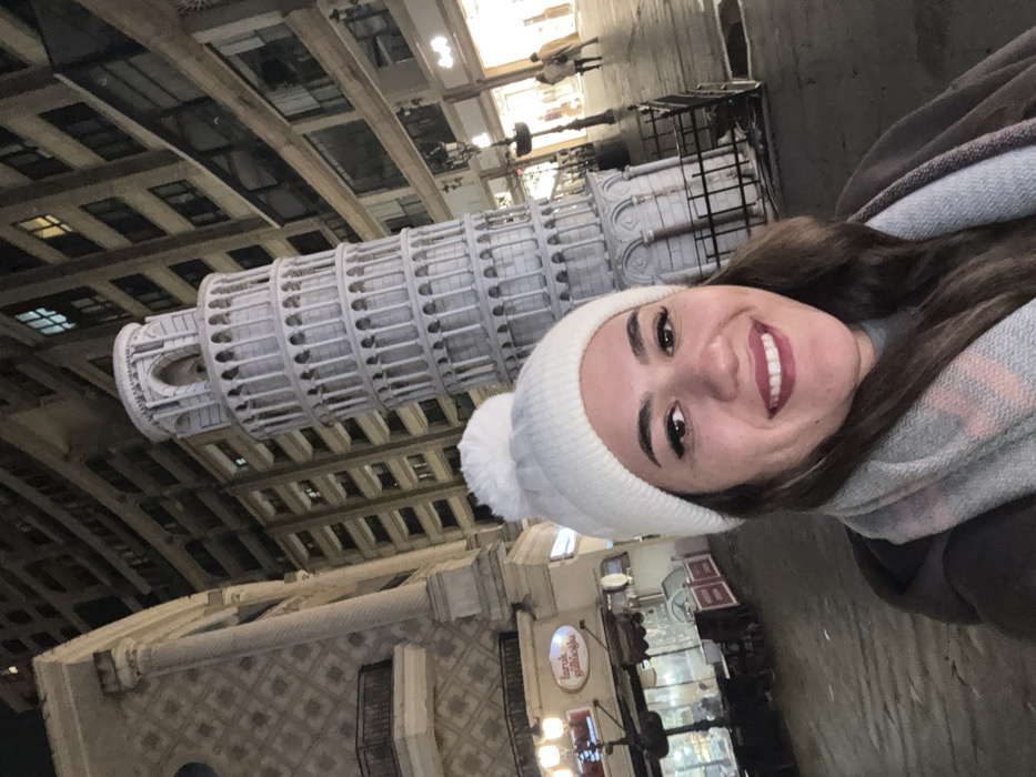 The image displays a nighttime urban scene in Esenler, Turkey. In the immediate foreground, a female individual with dark hair, wearing a white knit beanie with a pom-pom and a grey patterned scarf, smiles directly towards the camera. Behind her, a prominent, large-scale white replica of the Leaning Tower of Pisa stands slightly right of center, its base partially obscured by a dark metal barrier. To the left, a multi-story building features a decorative column and a patterned facade. Below this building, a commercial establishment identified by the illuminated sign "Faruk Güllüoğlu" is visible, featuring glass display cases and outdoor seating arrangements. To the far right, a tall building with multiple illuminated windows indicates residential or commercial activity. On a paved street or pedestrian area extending into the background, two indistinct human figures are visible. The scene is illuminated by artificial light sources from streetlights, building interiors, and commercial signage.