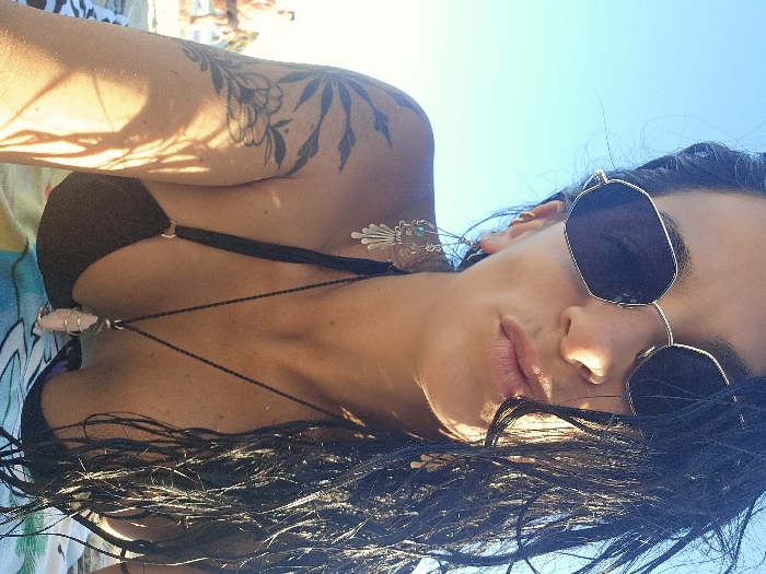 The image depicts a female individual on a beach in Armação dos Búzios, Brazil. She is positioned for a close-up, low-angle photograph, looking directly into the camera. She wears dark, hexagonal-framed sunglasses and a black bikini top. Her dark hair is wet and extends over her right shoulder. A prominent botanical tattoo featuring leaves and a flower is visible on her left upper arm. Accessories include large, dangling earrings on her left ear, adorned with turquoise beads and metallic elements, and a black cord necklace holding a pink, wire-wrapped crystal pendant. A small metallic stud is visible on her left nostril. The background reveals a clear blue sky and indistinct figures on a sandy beach. She is situated on a multi-colored beach towel. Strong sunlight is present, indicated by highlights and shadows on her skin and hair.