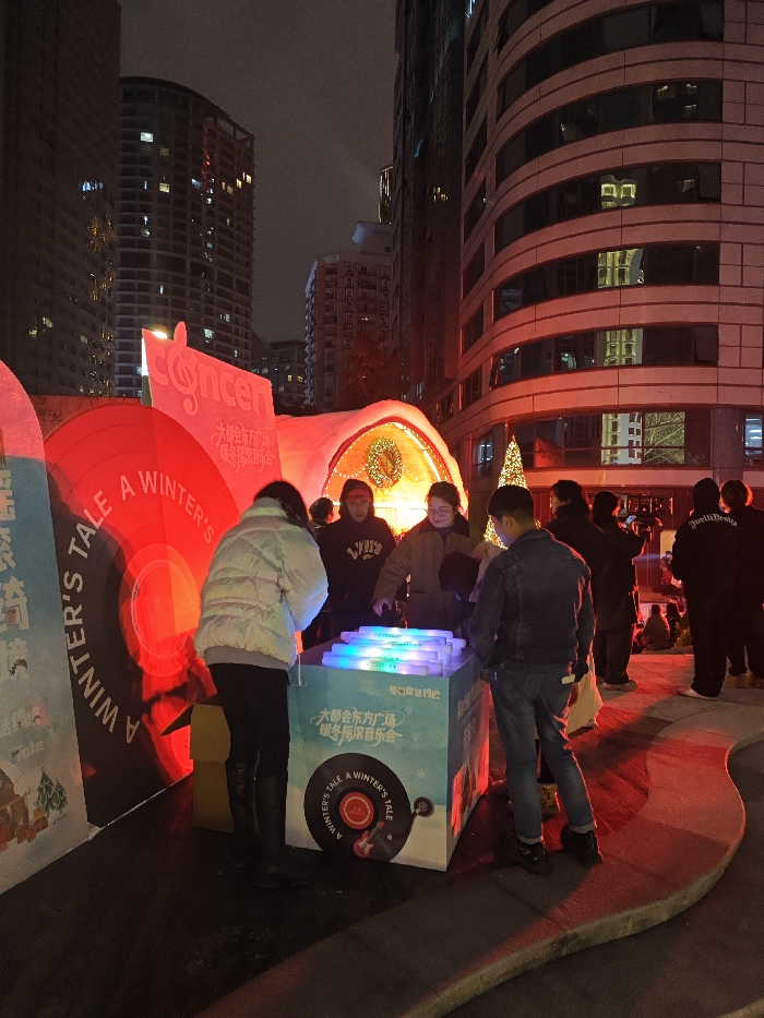 The scene depicts an urban outdoor public space at night in Yuzhong District, China, illuminated by artificial light. In the foreground, a group of approximately ten individuals is gathered around a prominent light blue rectangular kiosk-like structure. This kiosk features multiple rows of illuminated clear blocks on its top surface, emitting blue, green, and white light. Its sides are decorated with Chinese characters and the English text "A WINTER'S TALE," along with a graphic of a vinyl record containing a red interactive button also labeled "A WINTER'S TALE." A person wearing a light-colored puffer jacket and dark pants is leaning over the left side of the kiosk, appearing to interact with it. To their right, behind the kiosk, two other individuals are observing the display; one wears a dark hoodie with "LIVER" visible, and the other wears a light brown jacket and glasses. A male individual in a dark denim jacket and jeans stands to the right of the kiosk, also facing it. To the left of the kiosk, a large, upright red circular disc, resembling a vinyl record, is visible, displaying "A WINTER'S TALE" and a white "Concert" logo. Behind the kiosk, a white, arched, igloo-like structure with a glowing yellow interior and a visible wreath decoration stands. Further to the right, a small, decorated Christmas tree is positioned near a modern building characterized by horizontal banding. The ground is paved and reflects red light, suggesting a red floodlight illuminates the area from the left. Multiple high-rise buildings with illuminated windows frame the background, indicative of a city center. Other individuals are present in the mid-ground and background, observing the festive installations or moving through the space. The overall environment suggests a festive or event setting during the colder months.