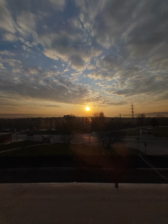 The image presents an elevated, panoramic view of Topoli, Bulgaria, during either sunrise or sunset. The sky, occupying the upper two-thirds, features a bright, low-angle yellow-orange sun centered on the horizon, radiating strong light and reflections. The immediate sky around the sun is golden-orange, gradually transitioning to a lighter blue overhead, all interspersed with numerous white and grey altocumulus cloud formations. Below the horizon line, the midground displays elements of the city. Multiple multi-story buildings, largely silhouetted, are visible, particularly on the left and center. Numerous leafless deciduous trees are scattered throughout the landscape. A prominent metal lattice power transmission tower stands on the right side, with multiple power lines extending horizontally across the frame. Ground-level areas consist of dark paved surfaces, possibly wet, reflecting light from the sun, alongside areas of sparse vegetation and what appears to be a small, square-shaped structure on a patch of grass. A distant, hazy landmass is visible on the far horizon. The immediate foreground is a dark, shadowed, horizontal concrete structure, likely a railing or building edge, indicating the image was captured from an elevated position. No individuals or specific actions are discernible within the scene.
