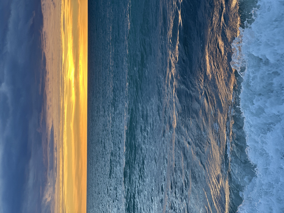 A vertical composition depicts a sunset over the ocean. The left shows a sky transitioning from dark blues to yellow and orange hues near the horizon. The ocean fills the majority of the image, its surface reflecting sunlight in vertical bands. Waves are seen on the right, their white foam contrasting with the darker water. The horizon line is low and clear, separating the sky and sea.