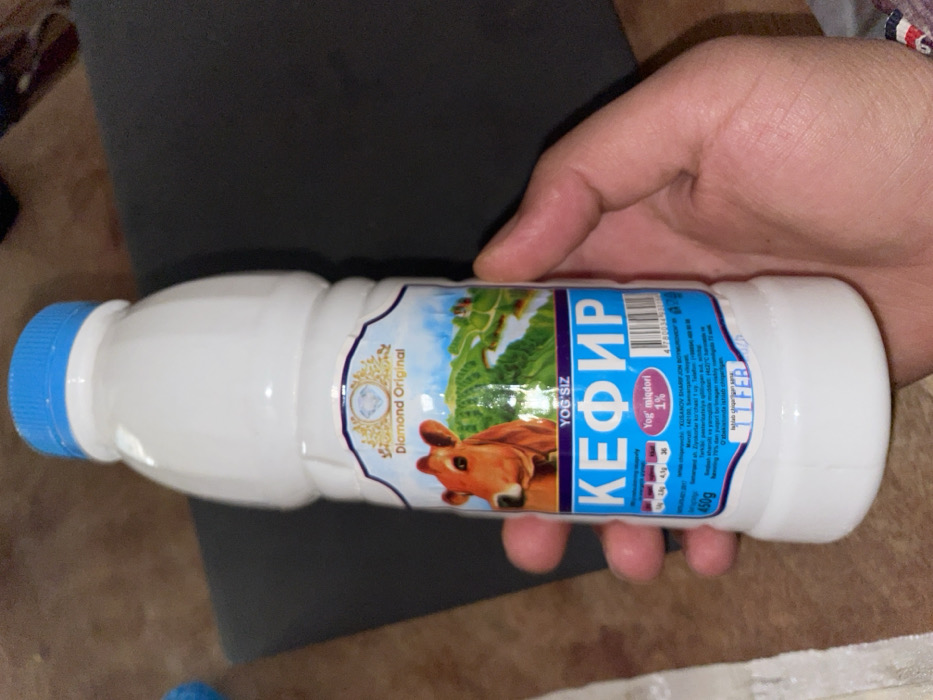 - "A human hand, with light to medium skin tone, holds a white plastic bottle of kefir" by FM-CQ3ql1, licensed under CC BY 4.0