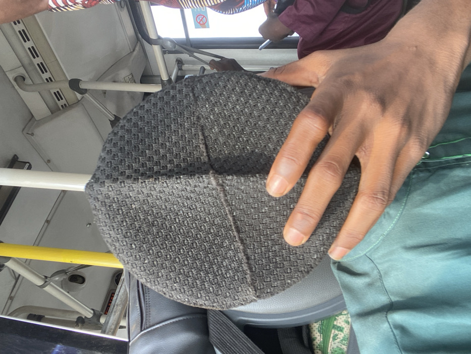 The scene depicts the interior of a public transport vehicle in Ebute-Metta, Nigeria. In the foreground, a person's right hand, with a brown skin tone, holds a dark grey, circular cap directly in front of their face. The cap displays a textured, woven pattern and is stitched into four distinct quadrants. The individual wears a teal-colored garment. To the subject's left, a black duffel-style bag with a visible zipper and strap rests on a dark grey seatback. Below the bag, a green and white patterned fabric is visible. The vehicle's interior background features white ceiling panels containing horizontal vents, white and yellow grab poles, and a small, dark dome-shaped security camera mounted overhead. A red "STOP" button is affixed to an overhead panel. To the right, another individual is partially visible, dressed in a dark red garment with patterned fabric on the shoulder. A "No Smoking" pictogram is visible on a panel or window frame to the far right, where bright ambient light enters the vehicle.