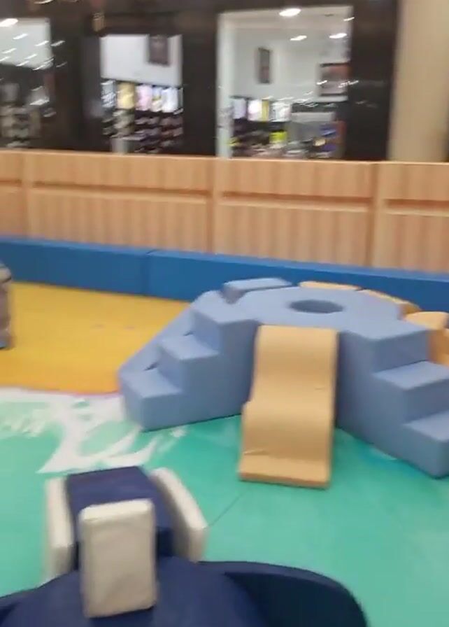 The camera pans across a colorful indoor play area