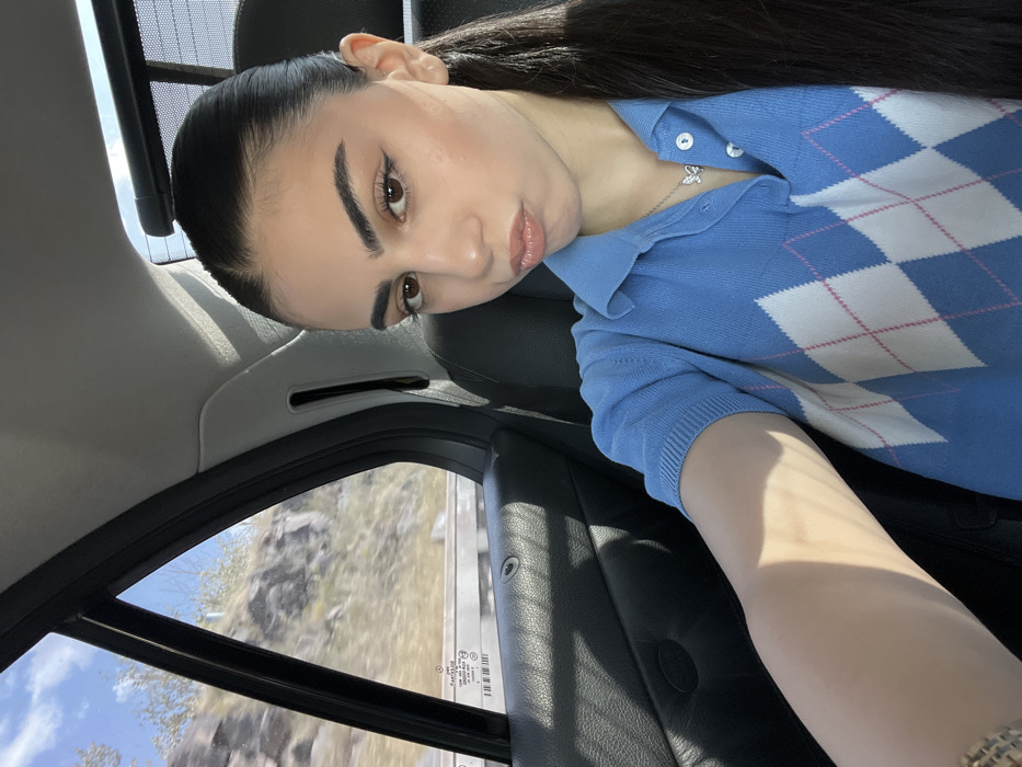 A young woman with dark hair is shown in a selfie inside a car. She is wearing a light blue argyle sweater with pink lines. Her hair is pulled back, and she has neutral makeup. The car window is open, showing a blurry landscape of trees and a road outside. The car's interior is mostly black and gray.