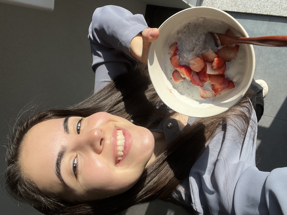 A female subject, appearing young adult with long, dark brown hair, is captured in a close-up, eye-level selfie. She is smiling directly at the camera, displaying upper and lower teeth, with her face illuminated by strong, direct sunlight from the right, creating distinct shadows on the left side of her face and hair. She wears a light blue or grey collared long-sleeved shirt with a visible dark button near the collar. Her right hand extends forward, holding a white ceramic bowl. The bowl contains a greyish-white mixture, consistent with chia seed pudding or yogurt, topped with multiple slices of red strawberries and a small amount of liquid. A dark brown wooden spoon is partially submerged within the bowl's contents. The background suggests an indoor setting, mostly obscured by shadow, with a brightly lit floor section visible in the lower right. The specific location within the city of Daegu, South Korea, is not discernible from the visual evidence provided.