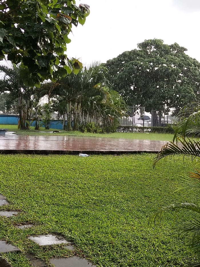 The scene depicts an outdoor environment in Rumuomasi, Nigeria, during active rainfall