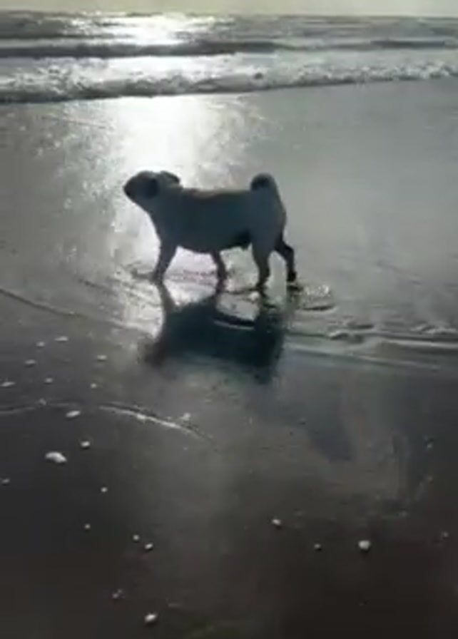 A pug stands in the shallow water of a beach