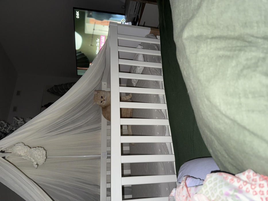 - "Inside a white crib draped with a sheer, white canopy, a light orange cat peers out, its paws visible between the bars" by FM-Mispt2, licensed under CC BY 4.0