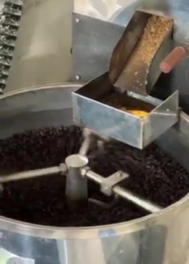 metal coffee roaster in operation. Inside the cylindrical roasting chamber, dark brown coffee beans are being tumbled by a rotating arm with three blades. Attached to the roaster is a metal hopper, which contains a light brown, fibrous substance.