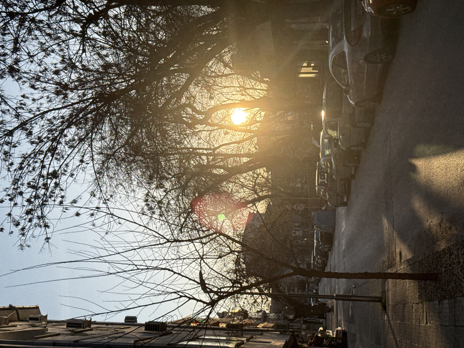 The image displays an urban street scene in Plovdiv, Bulgaria, illuminated by a low sun, indicating either sunrise or sunset. The sun, positioned in the upper right quadrant, is partially obscured by a dense line of bare deciduous trees, casting a strong golden-orange light and generating prominent red and green lens flare artifacts. The asphalt street occupies the central and right portions of the frame, extending into the background. Approximately ten to twelve passenger vehicles of various models and colors, including silver and red, are parked in a continuous line along the right side of the street. Long shadows from the trees and adjacent buildings stretch across the roadway. On the left, a paved sidewalk runs parallel to the street. A slender, leafless tree stands on this sidewalk in the foreground. A multi-story building, featuring multiple external air conditioning units on its facade, occupies the left side of the frame. In the background, partially visible through the trees, are circular street signs, one resembling a speed limit indicator. The sky overhead is clear, transitioning from a light blue to a bright yellow-orange hue near the horizon. No individuals are visible.