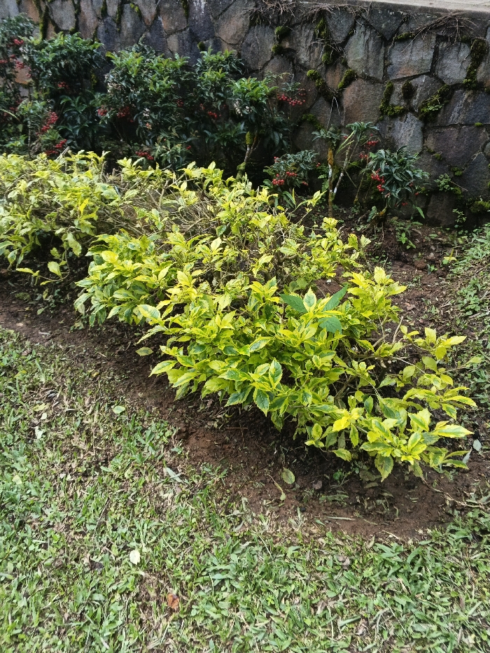 The image displays a landscaped garden area located within the city of Kwekwe, Zimbabwe. The foreground features a expanse of mown green grass, interspersed with minor patches of dry foliage and visible soil. Adjacent to the grass, a cultivated bed of dark brown earth contains a row of densely planted shrubs characterized by variegated green and bright yellow foliage. Behind these variegated shrubs, a second row of darker green bushes is visible, bearing numerous clusters of small, spherical red berries. The background is dominated by a sturdy retaining wall constructed from irregularly shaped, dark grey and brown stones, exhibiting patches of moss and other small green growth within its crevices. No human figures, animals, or observable actions are present within the scene.