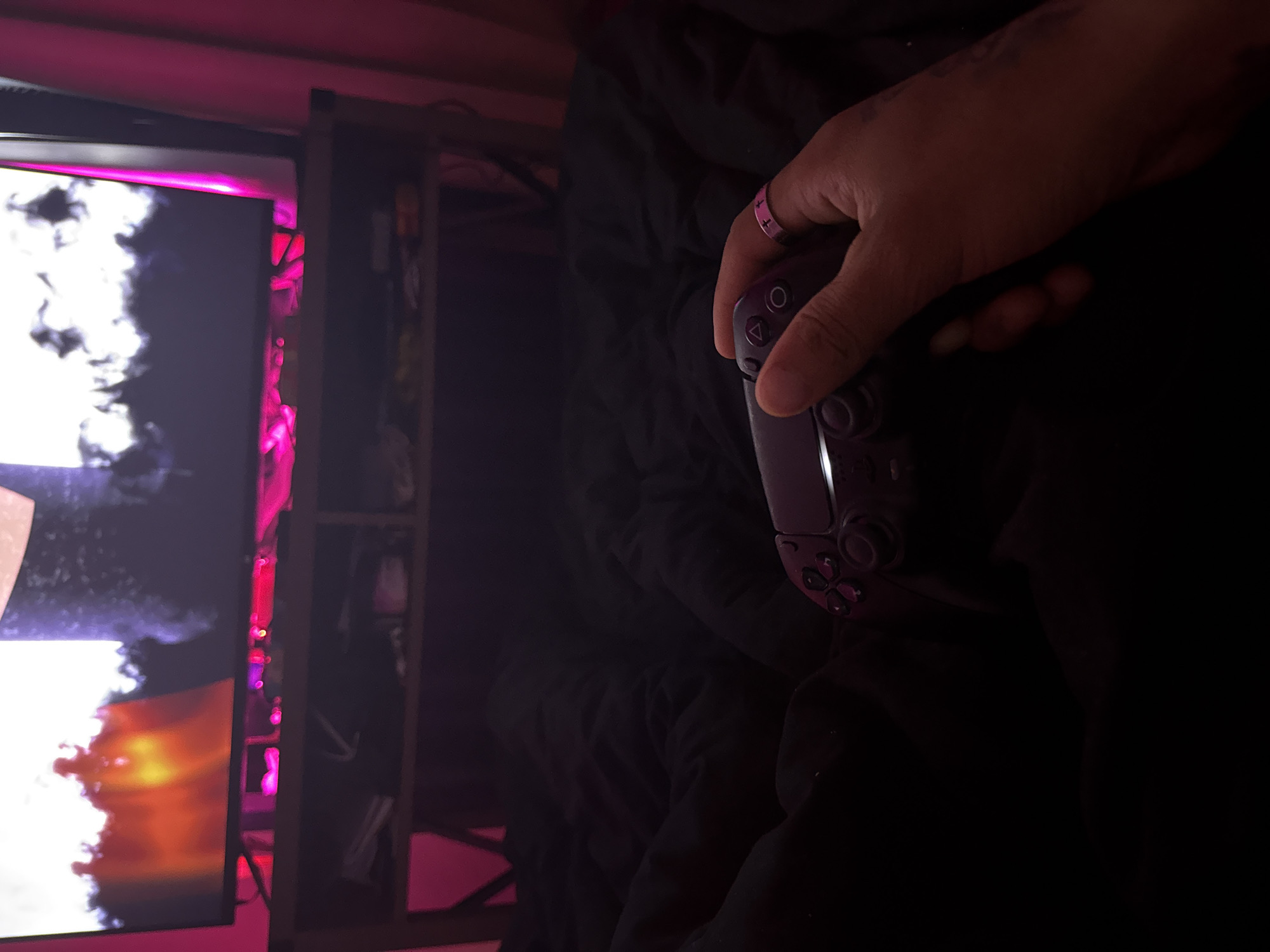 A close-up, dim, indoor shot shows a dark-skinned hand holding a PlayStation DualShock 4 controller. A ring is visible on the middle finger of the hand. A television screen is positioned on the left, displaying what appears to be a game or media content with white and orange visuals. To the right of the screen is a wooden shelf. The scene is illuminated with pink-toned ambient lighting, possibly from the television or other light sources. The environment is filled with what appears to be dark, rumpled fabric, likely bedding or clothing. The location is not discernible from the image.