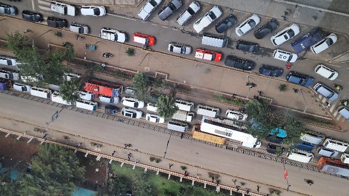 An elevated, oblique view captures a heavily congested urban highway in Nairobi, Kenya, identified as Uhuru Highway near the Central Business District
