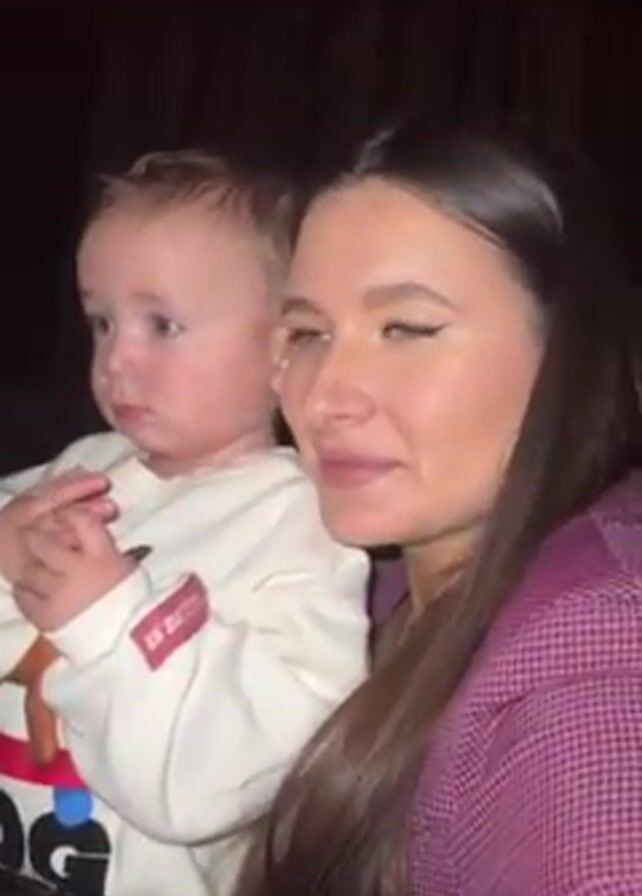 A woman with long brown hair and a purple blazer holds a toddler with blonde hair in her lap. They are in a dark theater. The toddler is wearing a white sweater with a cartoon dog on it. The woman is looking at the camera. There is music playing.