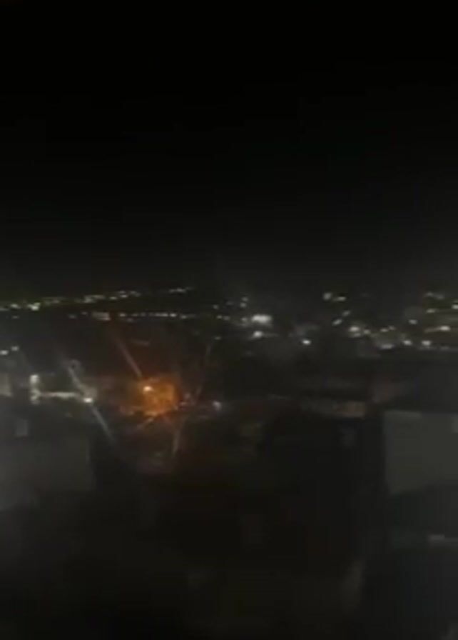 dark, nighttime cityscape from an elevated viewpoint. Numerous small, indistinct buildings are visible, illuminated by streetlights and faint lighting. The city extends into the distance, with a few scattered bright lights on what appears to be a higher elevation. The camera is static.